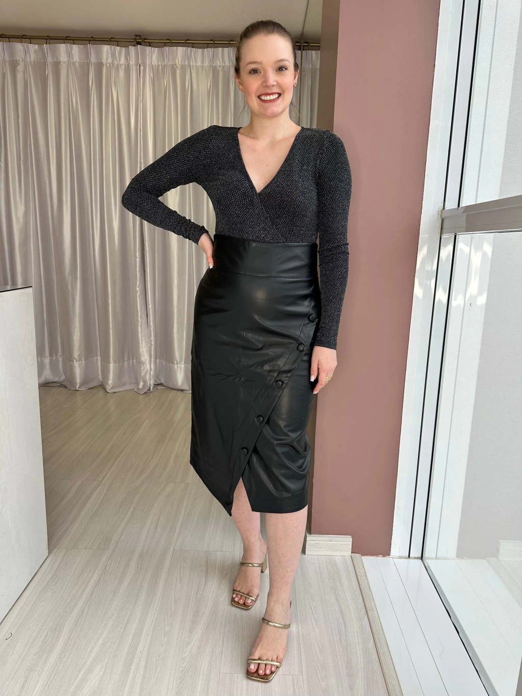 Saia midi confeccionada em PU, com modelagem transpassada e assimétrica para um visual moderno. Destaque para os botões frontais forrados. Possui cintura alta e cós largo, com fechamento por zíper invisível na lateral, garantindo um acabamento perfeito.